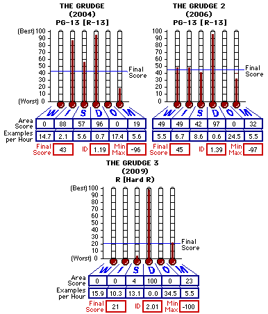 ![]() Cast/Crew Details Courtesy Internet Movie Database Production (US): Ozla Pictures, Sony Pictures Entertainment (SPE), Stage 6 Films, Unified Film Organization (UFO), Vertigo Entertainment Distribution (US): Sony Pictures Home Entertainment Director(s): Toby Wilkins Producer(s): Jeffery Beach, Doug Davison, Joseph Drake, Takashige Ichise, Nathan Kahane, Roy Lee, Andrew Pfeffer, Sam Raimi, Phillip J. Roth, Takashi Shimizu, Robert G. Tapert Screenplay: Brad Keene Cinematography/Camera: Anton Bakarski Music: Sean McMahon Film Editing: John Quinn Casting: Sunday Boling, Meg Morman Production Design: Bobby Michaels Viewed on Sony Pictures Home Entertainment DVD ![]() This film analysis is sponsored by E&HP. As the story goes, when someone is murdered in the grip of a powerful rage a curse is spawned in that place of death -- a grudge is born -- and those who enter that place of death will be touched by the curse and consumed by its fury. They who survive the fury will carry the curse with them ... And so on. Some years ago (The Grudge - 2004) in Tokyo, Japan an irate father, who discovered the unfaithfulness of his wife Kayako (Takako Fuji), brutally murdered her and their son Toshio (Yuya Ozeki) ... and the family cat ... and himself. A grudge was born. Somehow, that grudge which spawned in Tokyo moves to Chicago. Mother Kayako (Takako Fuji then, Aiko Horiuchi now - Fuji was better) and son Toshio (Yuya Ozeki then, Shimba Tsuchiya now) span the ethereal Big Pond to terrorize America, starting in apartment #305 on anystreet, Chicago. Max (Gil McKinney) and his two orphaned sisters, promiscuous teen Lisa (Johanna E. Braddy) and asthmatic adolescent Rose (Jadie Hobson), manage to manage the apartment building in which they reside. But Max may lose his job because people keep moving out of the building. No one wants to live in an apartment building in which a family was mutilated. The family of preteen Jake (Matthew Knight) was recently killed ... by the grudge ... in apartment #305. Jake is taken under the wing of Dr. Sullivan (Shawnee Smith) and moved to a care facility, but that does not stop Kayako from getting the last member of that family -- Jake himself. Within a locked padded room Kayako mutilated Jake. In a land far, far away -- Tokyo -- lived a woman named Naoko (Emi Ikehata) whose sister was forced during childhood by their shaman mother to drink a drop of a grudge victim's blood in a ritual to cast out the grudge. Naoko has since been following this grudge, learning her mother's ways. Naoko learns of the grudge moving to Chicago and relocates to Chicago with it ... to kill it if she can. Naoko enlists the help of Lisa and Rose to destroy the traveling grudge but becomes destroyed herself. Along with Max. After the possessed Max "kills" Naoko, she comes back to life possessed and kills Max. One is led to think the grudge is now dead. But the grudge never dies ... So we are led to believe. Names and places (and some levels of extremes of assaults on morality and decency) have been changed but the rest of the story is essentially the same as in the previous installments. Note that this is an R-rated film and rightfully so if for no other reason than the plethora of sexually immoral deeds -- expressed, implied and planned -- between Lisa and her boyfriend, Andy (Beau Mirchoff). Mirchoff and Braddy are introduced by making out standing, stumbling through the hallways of the apartment building, he putting his hands as close to her breasts as he possibly can until they enter yet another empty room (apartment #305 in this case) to strip and have sex ... again ... figuratively checking off another of the rooms they have used as a "play" room. In another case, a teen girl named Brenda (Mihaela Nankova) is seen, intimately seen, as she falls into a bathtub fully nude. At least the Motion Picture Association of America (MPAA) got it right this time. Each of the previous Grudge installments (The Grudge and The Grudge 2) was rated PG-13 but each earned a CAP final score equivalent to R-rated films (54 and below out of 100). But this 2009 installment earned a final score of 21, making it a hardcore R film. In other words, all three versions should have been rated R rating but only this third installment was. I cannot imagine why this third film in the Grudge trilogy would be engineered to garner a R rating when both of the previous two versions were PG-13. The implications are bold as to why a sequel to two films, each "approved" for 13 year old kids, is rated R but to voice the implications would be subjective and conjecture. You do the math. The following scoring data comparative of all three versions should help you in your calculations. ![]() Wanton Violence/Crime (W) - Zero out of 100 Matters of violence include brutal attacks resulting in graphic mutilations, mutilated bodies and other forms of gore. The film also capitalized on flashbacks of the brutalization of Kayako and Toshio from the first Grudge. While some connectivity to previous installments are certainly necessary to flow, the extreme extent was unnecessary. Yes, this is an R-rated film but that it is "R" does not excuse the influence of which God warns in 1 Cor. 15:33, Prov. 16:29 and many other verses. Impudence/Hate (I) - Zero out of 100 Atypical of R-rated films (and PG-13 films), this version projects profanity of one form or another (including the most foul of the foul words) 13 times, this is not to include the use of God's name in vain both with and without the four letter expletive discussed in the Offense to God investigation area below. Massive tattoos are noted once. Note that hatred is shown viciously by the father who murders his family but the CAP analysis model will not permit "double dipping" of scoring. Specifically, the scene is of the father murdering his family violently out of hatred/rage. Thus, the matter could be incorporated into the Wanton Violence/Crime, the Impudence/Hate or the Murder/Suicide inve