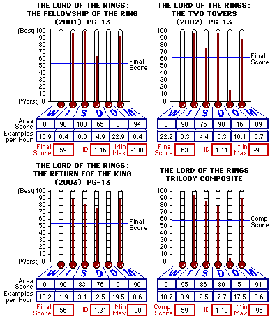 (2003), PG-13 -- ...it is "hardcore" PG-13.WITH COMPARATIVE STUDY ![]() Cast/Crew Details Courtesy Internet Movie Database Production (US): New Line Cinema, The Saul Zaentz Company Distribution (US): New Line Cinema Director(s): Peter Jackson Producer(s): Peter Jackson, Michael Lynne, Mark Ordesky, Barrie M. Osborne, Rick Porras, Robert Shaye, Frances Walsh, Bob Weinstein, Harvey Weinstein Written by: J.R.R. Tolkien Screenplay: Frances Walsh, Philippa Boyens, Peter Jackson Cinematography/Camera: Andrew Lesnie Music: Howard Shore Film Editing: Annie Collins, Jamie Selkirk Casting: Victoria Burrows, John Hubbard, Amy MacLean, Liz Mullane, Ann Robinson Production Design: Grant Major Art Direction: Joe Bleakley, Simon Bright, Dan Hennah, Philip Ivey, Christian Rivers Viewed At: Driftwood Theater 6 Let me put this 191-minute movie in the following light. It was certainly a technological masterpiece and is certain to make an indelible mark on many, but bodies were thrown around like sparks from a stirred campfire and severed heads were used as throwing weapons. And the use of evil (sorcery/witchcraft/wizardry) for good continues so this movie continues the trend of the LotR movies to violate the admonishment of Isa. 5:20 which warns "Woe unto them that call evil good, and good evil; that put darkness for light, and light for darkness; that put bitter for sweet, and sweet for bitter!" With a final score of 56 The Lord of the Rings: The Return of the King is the lowest scoring of the three LotR movies. It is indeed equivalent to the scores earned by PG-13 movies in the comparative baseline database of movies but is just two points out of one hundred above R-13. Though The Lord of the Rings: The Return of the King is a magnificent work of art it is "hardcore" PG-13, fortunately not because of the hardcore language and sexual immorality typical of PG-13s, but unfortunately because of intense and graphic violence [Prov. 3:31-32] and issues of occult - witchcraft, sorcery, wizardry (Offense to God). [Deut. 18:10 - 12; 2Chr. 33:6; Rev. 22:14-15] How can I call The Lord of the Rings: The Return of the King a work of art? Because of the skill and talents that went into a beautifully choreographed and orchestrated symphony of visual and audio excellence in a story of contrapositioned good and evil. Then how can I find issue with it if it is so magnificent? Because, in nutshell, art does not equal sin and sin does not equal art. Art becomes sin when art uses sin. The inference drawn from the beauty of the manner used to contraposition good and evil may lead some viewers to believe more of evil than evil is due. Whether intentional, such presentation of sensory and spiritual food can be trickery. And that leads me into a mini-sermon about trickery. Satan is the greatest trickster known to man. Satan has been very successful at tricking us. His first trick was mixing God's Truth with lies in fine-sounding argument and smooth talk -- Eve was the first victim of such deceit. And we have all suffered for it. One of Satan's greatest tricks is to convince many that God does not exist, keenly mixing that trick with the trick of convincing many others to think they don't need God: that we can deal with life, and death, all by ourselves, all on our own. Frosting for that trick is Satan convincing many of us that even he does not exist. Yet another great Satanic trick on mankind is to convince many that there are more than one god ... and goddess. Masterful is Satan in tricking us to believe that sin is not really sinful or that sin is relative: that there are no absolutes. Yet another of Satan's great tricks is convincing many that the Bible is no more than mortal man's attempts to control the populations with fear and calling it interpretation of God's Word thus making His Word seem subject to the personal and social preferences of the times the Bible was written. Satan has even convinced many of they who will not reject Jesus that God can be measured by their own standards. Another very successful trick of Satan's is to convince us at a young age that we do not have to answer to any authority, especially parental, and in doing so making it easy for us when grown to not submit to Jesus -- and be comfortable with it. Arrogantly. Amidst it all, Satan has tricked many of even the best of the believers that they have their heels dug in, steadfast in their faith as they compromise God's Word, situationally redefining it, counterfeiting it and conditionally applying it to fill their own bellies. All in the name of "interpretation." And the greatest of all of Satan's tricks is to convince us we are immune to his tricks, leading us by the nose into sin and away from Jesus while we think we are safe. These are just a few ... [John 10:10] Frodo (Elijah Wood) and Sam (Sean Astin) continue their journey to Mordor and ultimately to Mount Doom to throw Precious into the inferno of Mount Doom from which the ring was made. "Precious" is a name given to the focal ring which conjures in the wearer lust for evil and makes the wearer invisible. Yes, knowledge of the previous two installments of the LotR trilogy is necessary to understand anything about this third and final installment since The Return of the King takes up where The Two Towers left off. The ring has to be destroyed to defeat the combined forces of evil. Aided by the equally evil Gollum (Andy Serkis), who once was the hobbit Smeagol (also Andy Serkis) until changed by the power of the ring into the demon-like Gollum because of Smeagol's lust for it demonstrated by murdering his companion (who found the ring) for the possession of it, Frodo and Sam trek to Mount Doom for the sole purpose of destroying the ring in the only place that can destroy it -- the fires of Mount Doom. Frodo is wrought with fear, paranoia and confusion as Gollum tries his best to get the ring from Frodo. Gollum is foiled and put in his place each time by the loyal and devoted Sam, even though Fro