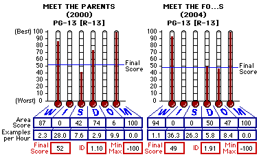 ![]() Cast/Crew Details Courtesy Internet Movie Database Production (US): Universal Pictures, DreamWorks SKG, Tribeca Productions, Everyman Pictures Distribution (US): DreamWorks Distribution LLC., Universal Pictures Director(s): Jay Roach Producer(s): Robert De Niro, Jon Poll, Jay Roach, Jane Rosenthal, Amy Sayres, Nancy Tenenbaum Story: James Herzfeld, Marc Hyman Screenplay: John Hamburg, James Herzfeld Cinematography/Camera: John Schwartzman Music: Randy Newman Film Editing: Jon Poll Casting: Francine Maisler Production Design: Rusty Smith Art Direction: Andrew Neskoromny Viewed At: Driftwood Theater 6 While there is nothing particularly sexually explicit in this film, I feel this analysis should carry a WARNING since the focus of the entire film is clearly on a euphemism of the most foul of the foul words. And every advantage of the phonic similarity is taken by the writers, even in the wife's name change traditionally performed through marriage. "It's just a name!" Not the way Hollywood used it in this teen sex flick. Yes, it may actually be somebody's name and there is nothing wrong with that. What is wrong is how Hollywood abused the name. If that is your name there is no denigration intended by my refusal to spell it out. If it is your name and you are offended, take your anger to Hollywood. They are the ones who have abused it. I will not submit to the phonetic euphemism games of Hollywood. And if that makes me sound like a fanatic or lunatic, so be it. As was Dr. Martin Luther by his own words, my conscious is captive of the Word of God. Besides Jesus said that many will hate we who love Him. [Luke 6:22] While walking out of the theater after the Tuesday night screening, I over heard a woman say "That will be #1 this weekend." Unfortunately, she is probably right. But what does that say about our entertainment diet? This film is of the caliber typical of Ben Stiller but what a come-down for Barbara Streisand, Dustin Hoffman and Robert De Niro. And the wholesome lifestyle looses again to Hollywood sexual ... anything. Those of you who subscribe to our enewsletter should already have the Findings/Scoring data for this film in your mailboxes. I sent it out at 5:00 AM today (December 22, 2004). I tried to get this page up with at least the Findings/Scoring section this morning but I had to give our 14 month old Angela her 5:00 AM feeding and breathing treatment. Sorry, but she takes precedence. And I had to get at least a little sleep. Meet the Fo...s is the sequel to Meet the Parents of 2000. Following is a scoring data comparative for your convenience. Morally speaking, Meet the Fo...s is another pea in the same pod except this 2004 pea has been spiced with significantly more language and sexual immorality material than the 2000 pea. Makes sense. For two reasons. The very name of this 2004 film is sexually oriented. And it has been four years further into moral decay since the 2000 version (see R-13): ![]() Gaylord Myron "Greg" Fo...r (Ben Stiller) and Pamela Martha Byrnes (Teri Polo) have decided to tie the knot after nearly two years of living together in cohabitation which started a little bundle of joy. [Gen. 34:7, Hebr. 13:4] Since they have decided to get married, they felt it a good idea for the Byrnes, Jack and Dina (Robert De Niro, Blythe Danner) to meet Greg's parents, Bernie and Roz (Dustin Hoffman, Barbara Streisand). Greg had met the Byrnes but his parents had not met her parents. Jack and Dina are now with toddler grandson Little Jack (Spencer and Bradley Pickren), son of their daughter and her husband who are away on a trip. There is a key function of the Little Jack part in this film ... to utter a foul expression picked up from Greg, at least ten times. [Luke 17:2] Greg arranges for the families to meet by the Byrnes going to Florida to meet Greg's parents. The story in Meet the Parents created the Byrnes as a reserved, regimented, orderly pair. There is no change in the Byrnes from Meet the Parents. At least not in the beginning. Remember, the wholesome lifestyle looses again to Hollywood sexual ... anything. Greg's parents are sexually as loose as the proverbial goose. Greg's parents have cast off all sexual inhibitions and modesty in favor of the spiritual enlightenment of sexual freedom. Bernie is a lawyer turned stay-at-home husband. Dr. Roz is a therapist specializing in elderly sexuality. Even their dog is outside the sphere to which moral standards apply. I am not going to spend any more time on summarizing the story. The CAP thermometers above say enough about this film if you have seen Meet the Parents. If not, the listing in the Findings/Scoring section will provide the details to help you to be in a better position to make your own moral decision whether this film is fit for your 13 years old children (or yourself). This film is the perfect manifestation of Ps. 12:8, Col. 2:8, Prov. 30:12, 2 Pet. 2:18 and many others. SCRIPTURAL APPLICATION(S) If needed to focus or fortify, applicable text is underlined or bracketed [ ] or bold. If you wish to have full context available, the Blue Letter Bible is a convenient source. If you use the Blue Letter Bible, a new window will open. Close it to return here or use "Window" in your browser's menu bar to alternate between the CAP page and the Blue Letter Bible page. CHAPTER/VERSE ***Selected Scriptures of Armour against the influence of the entertainment industry*** As always, it is best to refer to the Findings/Scoring section -- the heart of the CAP analysis model -- for the most complete assessment possible of this movie. |