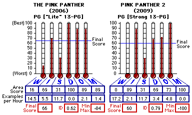 ![]() Cast/Crew Details Courtesy Internet Movie Database Production (US): Metro-Goldwyn-Mayer (MGM), Columbia Pictures, Robert Simonds Productions Distribution (US): Metro-Goldwyn-Mayer (MGM), Sony Pictures Releasing, MGM Home Entertainment Director(s): Harald Zwart Producer(s): Shawn Levy, Ira Shuman, Robert Simonds Screenplay: Scott Neustadter, Michael H. Weber, Steve Martin Story:, Scott Neustadter, Michael H. Weber Characters: Maurice Richlin, Blake Edwards Cinematography/Camera: Denis Crossan Music: Christophe Beck Film Editing: Julia Wong Casting: Ilene Starger Production Design: Rusty Smith Art Direction: Matthieu Beutter, Rick Butler Viewed on Fox Home Entertainment DVD ![]() This analysis is sponsored by the generosity of C&EZ and E&HP. The final score of 60 earned by Pink Panther 2 places the film content six points morally worse than the lite 13-PG Pink Panther (2006) which earned a final score of 66. The final score of 60 earned by Pink Panther 2 also makes the overall magnitude of the content of the PG-rated film morally equivalent to the typical content of a strong PG-13 film in the comparative baseline database of films. Thus the "Strong 13-PG." For those of you who recently joined the CAP services, "13-PG" means a PG-rated film which earns a final CAP score in the range of scores earned by PG-13 movies (55 to 67 out of 100) in the comparative baseline database. For more information on CAP equivalency nomenclature see the legend at the bottom of the NOW PLAYING and COMING SOON page. The most serious losses of points in the film were due to a saturation of it with slapstick "comedy" violence and with sexual innuendo and inferences plus one instance of sexual vulgarity. The film content found by the Wanton Violence/Crime (W) and Sexual Immorality (S) investigation areas each earned area scores equivalent to the same area scoring as many R-rated films (54 and below out of 100), not because of the severity of any individual instances of slaps on the face of morality and decency but in the sheer numbers of them (see our CAP Rule of 1000 for more information). Following is a scoring data distribution comparative of the two versions of the film. It should help you get a visual "feel" for the similarities as well as the differences in morality content of the two films. ![]() "Sexual vulgarity." That is a term I used above to describe some of the content of this film the MPAA says, by slapping a PG on it, is fit for your adolescents. Well, that is not their decision to make. That is your decision to make. The content that I [subjectively] term as vulgar was when a character named Mrs. Berenger (Lilly Tomlin) instructed Inspector Clouseau (Steve Martin) on political and social correctness when dealing with and when speaking to and about women while in such a highly visible public service position. Tomlin spoke highly descriptively and even seductively of female anatomy and the sexual-oriented features and functions of it such as "nooks and crannies" as she taught Clouseau the "don'ts" of proper etiquette and 'political correctness' regarding women. As a result, Clouseau was portrayed as sexually aroused. Not that I agree such descriptives should be in any film, it most certainly should not be in a PG film. Other sexually-tainted references and innuendo such as naming a cat "Caligula" (an intensely sexually perverted Roman Caesar) did not help the Sexual Immorality score. Granted, most of the PG age stratum kids do not know of Caligula but adults do when the children mimic what they've heard. After a ten-year hiatus the world's greatest thief, The Tornado is back in action stealing priceless artifacts: the Shroud of Turin; the Magna Carta; the Imperial Sword; the Pope's ring ... including the Pink Panther diamond. Clouseau's boss, Chief Inspector Dreyfus (John Cleese), was ordered to put Clouseau in charge of a specially formed elite team of expert detectives, The Dream Team because Clouseau was felt to be the world's top detective since he cracked the stolen Pink Panther diamond case ten years ago. For those years, Inspector Clouseau has been the target of Dreyfus' professional attention who expressed his feelings about Clouseau by delegating Clouseau to the highly sensitive mission of interest to national security: parking ticket detail. Clouseau wears his Medal of Honor (which Dreyfus wanted and tried for in the first Pink Panther) hanging from his neck every day and every day reminds Dreyfus that he won the medal: that Dreyfus did not. Nevertheless, Dreyfus must assign Clouseau to head the Dream Team ... another slap in Dreyfus' professional face. That a dum-dum like Clouseau should get the elite job Dreyfus felt he should get was a thorn in Dreyfus' side. Serendipitously and much to the chagrin of Dreyfus, Clouseau makes a key observation as a street meter cop that later again places Clouseau in the spotlight of honor. Clouseau must now report to Kyoto, Japan to meet with the rest of the Dream team -- and leave Nicole Durant, his heart throb and professional associate for years. Because of being reassigned out of town, Nicole pines at the loss of her beau who will be gone for an undetermined length of time. Together as they share remorse at the impending parting they remember a night three months earlier at the La Plata de Nada (the plate of nothing) restaurant which Clouseau burned down by his slapstick bumbling. "It was a night to remember that we must forget." As they try to share a "professional goodbye hug" Gendarme Gilbert Ponton (Jean Reno), Clouseau's partner sticks his head in the office and unintentionally forces the pair to fake their co-attraction. On his way to the Charles de Gaulle airport with Ponton, Clouseau brags that the Pink Panther diamond, protection of which was the Chief Inspector's job, would be vulnerable if Clouseau left France. Sure enough, as Clouseau steps over the "You are now leaving France" border at the airport, a public announcement is made tha