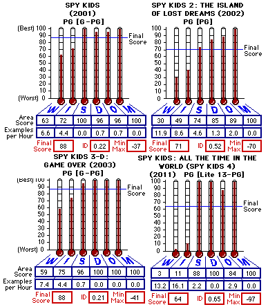 ![]() Production (US): Spy Kids 4 SPV, Dimension Films, Troublemaker Studios Distribution (US): Bob Weinstein, Harvey Weinstein, Rebecca Rodriguez, George Huang Director(s): Robert Rodriquez Producer(s): Robert Rodriquez, Elizabeth AvellŒn Written by: Robert Rodriquez Cinematography/Camera: Robert Rodriquez, Jimmy Lindsey Music: Carl Thiel, Robert Rodriquez Film Editing: Dan Zimmerman Casting: Mary Vernieu, JC Cantu Production Design: Steve Joyner, Caylah Eddleblute Viewed on The Weinstein Company Home Entertainment DVD ![]() Because of a lot of violence and adolescent disrespect and hatefulness toward a parent, Spy Kids: All the time in the World (Spy Kids 4), a PG film earned a lite 13-PG final score of 65 out of 100 which means the PG-rated film earned a final score in the range of scores earned by PG-13 movies (55 to 67 out of 100) in the comparative baseline database. And since PG-13 films in the developmental comparative baseline database earned Influence Density figures from 0.55 to 0.77 (the higher the figure the more severe the density of assaults on morality and wholesomeness), the Influence Density figure of 0.65 for this film confirms the PG-13 equivalence of this film. The film would not have been Spy Kids 4 without some violence but the film would have earned a G-equivalence final score if it were not for the extent of violence and adolescent disrespect and hatefulness found. One might think it difficult to present enough "PG" violence for the violence envelope to be R-equivalent. But there is so much of it and some of the examples of violence, such as the image of a blade at a character's throat with a threat to kill, severely challenge the right to be hailed as "PG." No blood, no guns, no booze, no nudity, no profanity and no deaths does not assure "PG." Juni (Daryl Sabara) and Carmen (Alexa Vega) are back as adult agents of OSS but as supportive characters rather than quintessential characters. The stars of the show are Cecil (Mason Cook) and Rebecca Wilson (Rowan Blanchard). Cecil and Rebecca are the children of Wilbur (Joel McHale), TV Spy hunter, and stepmom Marissa (Jessica Alba), real time spy and agent of OSS. Marissa was a spy at least until the birth of their baby (Belle and Genny Solorzano) when Marissa decided to retire from OSS. By the way, Uncle Machete (Danny Trejo) is also back for a short appearance. And R.A.L.P.H makes a short appearance, too. This time the main bad guy is the Time Keeper (Jeremy Piven) who has revived the Project Armageddon experiment from the 1930s to progressively speed up time to where years become days and hours become seconds. The only thing that can stop the Armageddon is the Chronos Sapphire. The only known piece of the Chronos Sapphire is in Marissa's necklace which she gave to Rebecca. Somehow, Cecil and Rebecca must get the Chronos Sapphire put in to the Armageddon device to stop it before the Time Keeper ends the world. The scoring distribution of the four Spy Kids films makes a great data comparative (shown below), revealing perfectly the decay on morality of content over eleven years of filmmaking, especially the most recent 8 years. The comparative below is great proof of what I have been preaching for years: that we have become so drugged by the narcotics of extremes in and as entertainment that what once was morally unacceptable has become morally invisible: that, like drug addiction, it takes more of the drug (extremes in the case of entertainment) in the next "fix" (the next film) to get the same "high" (level of cinematic stimulation) Such a revelation is provided evidence by the progression of ignominy over the eleven year Spy Kids franchise. Each of the four installments is rated PG and each of the first three earned G or PG-equivalence under the CAP Analysis Model (note the two G-PG installments were only two points above the top of the scoring range earned by PG films). But the latest installment, Spy Kids 4, also rated PG, earned a PG-13 equivalent final score.