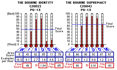 ![]() (2004), PG-13 -- ... I may have missed an issue or two ...... ![]() Cast/Crew Details Courtesy Internet Movie Database Production (US): The Kennedy/Marshall Company, Universal Pictures, Hypnotic, Ludlum Entertainment Distribution (US): Universal Pictures Director(s): Paul Greengrass Producer(s): Patrick Crowley, Matt Jackson, Doug Liman, Frank Marshall, Henning Molfenter, Henry Morrison, Colin J. O'Hara, Paul Sandberg, Andrew R. Tennenbaum Novel: Robert Ludlum Screeplay: Tony Gilroy Cinematography/Camera: Oliver Wood Music: John Powell Film Editing: Richard Pearson, Christopher Rouse Casting: John Hubbard, Joseph Middleton Production Design: Dominic Watkins Art Direction: Philip Elton, Gary Freeman, Sarah Horton, Sebastian T. Krawinkel, Aradhana Seth Viewed At: Driftwood Theater 6 Please understand that I may have missed a few things while viewing this film. Just hours before viewing the film four things happened that made concentration most difficult. First, at 9:00 AM that morning was the adoption judge approved our adoption of Melody Caitlyn. Second was only three hours sleep the night before. The third and fourth were bad financial news ... from two separate fronts. So, I may have missed an issue or two of assault on morality and decency in this film. Even if I did, if you have not seen the film this report is still useful. You will know more about the content of the film. Besides, if any missed points were incorporated the scoring would be lower and the listing of issues of ignominy would be longer. This is not a "Bourne again" film or a "re-Bourne film." It is a "Bourne all over again" film. More of the same as in The Bourne Identity of 2002 but at different locations with different faces. More espionage and more government corruption. And more killing. Still amnesiac Jason "James Bond" Bourne (Matt Damon), a member of a CIA decommissioned assassin squad, is accused of killing someone he was not supposed to kill. Bourne now fights in the reactionary mode to save his own life while explosions of memory pieces invade his attitude as well as abilities. Not all the pieces of memory that return are welcome. In more action than acting, from the sizzling beaches of India to the snow-covered streets of Moscow, Bourne treks to find those responsible for his trouble and even the score. The story opened with Bourne cohabitating [Hebr. 13:4] with his girlfriend from The Bourne Identity, Marie (Franka Potente) when their laid-back existence was riled by a would-be assassin, Kirill (Karl Urban). Kirill was trying to kill Bourne but instead killed Marie. Bourne had been framed for killing a CIA agent in Berlin to cover up the theft of $20 million CIA seed money by agents within the CIA. From that point, Bourne launched every fiber of training and experience he had to get revenge. [Rom. 12:19, Luke 6:29] Several notables are involved in the mission to get Bourne. Pamela Landy (Joan Allen), Bourne's old boss, is queen bee of the team assembled to kill Bourne. Aiding in the search was expert spy, Ward Abbott (Brian Cox) who is a key factor in the frame=up and theft of CIA money if you decide to watch this thriller. Julia Stiles appears for a while as Nicki, a psychological counselor to applied emotional band-aides to the mental battle scars of the earlier assassin squad. Nicki supplied some character details about Bourne no one else would know. As with other original-sequel pairs of films we try to provide you with a comparative of the sequel to the original to help you decide whether the sequel is morally watchable just in case you have seen the original. Following is the comparative data display for the Bourne pair. ![]() By the comparative scoring display above, The Bourne Supremacy is as severe as The Bourne Identity in violence/crime [Ps. 7:16, Prov. 3:31-32, Prov. 10:23] but is not as severe as it in any of the other five CAP investigation areas. In fact, The Bourne Supremacy was a little more violent than The Bourne Identity as noted by comparing the Examples per Hour figures in Wanton Violence/Crime for each film. The Examples per Hour figures become useful especially in such cases as original-sequel pairs when both of the films earn a zero score in one or more of the investigation areas. Though there were more examples of violence in The Bourne Supremacy, the film was a little less dense in total assaults on morality and decency than The Bourne Identity as shown by the difference between the CAP ID scores for each film. The final score of 66 of The Bourne Supremacy clearly indicates a film of lesser total severity than The Bourne Identity but still severe enough to warrant your close inspection of the listing in the Findings/Scoring section of this report before making your own informed decision whether it is fit for your family. The score of 66 places The Bourne Supremacy squarely at the top of the scoring range earned by PG-13 movies (55 to 67 out of 100) in the comparative baseline database. The only noted issues of sexual immorality were cohabitation and dressing to maximize the female form and/or skin exposure (which was not nearly as revealing as the "S&M" outfit in Catwoman). [Col. 2:20 - 23] And there was only one instance of drinking alcoholic beverages and no instances found of smoking tobacco or drugs. There was one use of God's name in vain with the four letter expletive and one without [Deut. 5:11] and one use of the most foul of the foul words and only six uses of other examples of the three/four letter word vocabulary. [Col. 3:8] And that is a foul language distribution most atypical of the trend of PG-13 movies. [Ps. 12:8 (See our R-13 http://www.capalert.com/r-13,htm)] The listing in the Findings/Scoring section will provide all that was noted. SCRIPTURAL APPLICATION(S) If needed to focus or fortify, applicable text is underlined or bracketed [ ]. If you wish to have full context available, the Blue Letter Bible is a convenient source. If you use the Blue Letter Bible