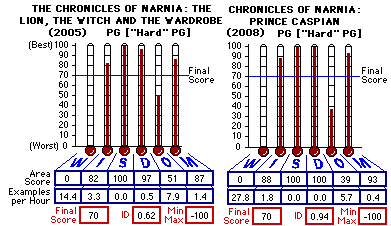 ![]() Cast/Crew Details Courtesy Internet Movie Database Production (US): Walt Disney Pictures, Walden Media, Ozumi Films, Propeler, Silverbell Films, Stillking Films Distribution (US): Walt Disney Home Entertainment Director(s): Andrew Adamson Producer(s): Andrew Adamson, Douglas Gresham, K.C. Hodenfield, Mark Johnson, David Minkowski, Perry Moore, Marianna Rowinska, Poland Philip Steuer, Matthew Stillman, Diego Zanco Screenplay by: Andrew Adamson, Christopher Markus, Stephen McFeely Novel: C. S. Lewis Cinematography/Camera: Karl Walter Lindenlaub Music: Harry Gregson-Williams Film Editing: Josh Campbell, Sim Evan-Jones Casting: Nancy Bishop, Pippa Hall, Liz Mullane, Gail Stevens Production Design: Roger Ford Art Direction: Frank Walsh (supervising art director) Viewed on Walt Disney Home Entertainment DVD, Distributed by Buena Vista Sponsored by the generosity of CZ This is not a "Christian" film. That the film is based on the works of a Christian author does not make the film Christian. It has been a year since the four child kings and queens of Narnia came back through the wardrobe to the reality of London in The Chronicles of Narnia: The Lion, the Witch and the Wardrobe. The children; Peter (Peter Pevensie), Susan (Anna Popplewell), Edmund (Skandar Keynes) and Lucy Pevensie (Georgie Henley) have aged but one year since the doors of the Wardrobe last closed. But the lands of Narnia have aged 1300 years, Aslan seems nowhere to be found and evil Lord Miraz (Sergio Castellitto), adult uncle of teen heir to the throne Prince Caspian the Tenth, is plotting to kill the prince after killing his brother, the prince's father, some years ago. All this chicanery is to ensure uncle Miraz becomes king of the land. Since Caspian is the rightful heir to the throne when he reaches adulthood, Miraz stands to lose his self-claimed crown unless another heir is established. Lo and behold Queen Prunaprismia (Alicia Borrachero), Miraz's wife, gives birth to a son. Now Miraz sees no need for Caspian. What is the common denominator the above paragraph? Since you've asked I'll tell you. Killing. That is the underlying theme to Chronicles of Narnia: Prince Caspian. There is enough killing and other violence in this Narnia installment to make the film equivalent in violence to some R-rated features. Enough to earn the film an investigation area score of zero in Wanton Violence/Crime. More about this in the individual investigation area discussions following this summary/commentary. As Prince Caspian the Tenth is running for his life from Miraz's Telmarine soldiers through the woods, Caspian runs into some remnant surviving Narnians: two dwarfs, Trumpkin (Peter Dinklage) and Nikabrik (Warwick Davis); a talking badger, Trufflehunter (Ken Stott ). Side Note: Though Dinklage did not get much screen time he was, in my opinion, one of the best performers of the whole cast. Just before Caspian fled Miraz's castle, old confidante Doctor Cornelius (Vincent Grass) gave Caspian a strange horn with orders to blow the horn only if all is lost. It was the horn given to Queen Susan 1300 years ago. It had "magical" powers to summon the four child kings and queens back to Narnia. In a moment of pain and submission after being knocked off his horse while speeding through the woods, Caspian blows the horn. And when he does, the long-gone four child kings and queens of Narnia reappear in Narnia -- one year older and 1300 years after they left. In a subway tunnel with a runaway subway train speeding by them, the four child kings and queens are transported back to Narnia ... 1300 years after they left Narnia one year ago. After the train disappears into the horizon the kings and queens of Narnia find themselves on a Narnian beach near Cair Peravel. Exploring the area the four kings and queens find the 1300 year old runs of their kingdom ... their royal garb and weaponry still there. From there, the child kings and queens of Narnia enable the Narnians to recapture their land. I will not try to itemize the story or plot. Let me now get into that which most parents, grandparents, pastors, youth leaders and more come to our pages to learn. Below is a comparative of the scoring data for both Narnia films. Caspian is nearly a moral carbon copy of The Lion, the Witch and the Wardrobe with the same configuration of losses. They each even earned the same final score of 70. Both films are high scoring in Impudence/Hate, Sexual Immorality, Drugs/Alcohol and Murder/Suicide. Both films earned a zero score in Wanton Violence/Crime and a relatively low score in Offense to God. In a more familiar perspective, both films are G-equivalent in Impudence/Hate, Sexual Immorality, Drugs/Alcohol and Murder/Suicide but are R-equivalent in Wanton Violence/Crime and Offense to God. ![]() A note on the R-equivalent scoring. The R-equivalence (a score of 54 or below out of 100) is not because of the intensity of violence of any particular instance of violence as is typical of R-rated features but because of the sheer number of them. For more information see our CAP Rule of 1000 publication. Wanton Violence/Crime (W) - Zero out of 100 This investigation area found enough violence to earn a Wanton Violence/Crime investigation area score of zero. There is much sword play and deaths by swords, by arrows and other improvised weaponry. Much attempted murder and planning of murder. Blades and crossbows are also used to threaten and hold hostage. Much intense warfare and battle. Though there is no gore noted there are numerous instances of individualized killings during battle scenes. See the itemized listing in the Findings/Scoring section for a more complete accounting of the violence content. [Prov. 13:2, Amos 3:10, Prov. 16:29, Prov. 3:31-32, Ps. 7:16] Impudence/Hate (I) - 88 out of 100 While childbirth is certainly a beautiful thing, but it would be best left out of entertainment for children. The scene of Queen Prunaprismia giving birth to a child is rather grap