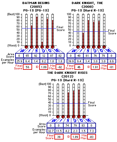 Cast/Crew Details Courtesy Internet Movie Database Production (US): Warner Brothers, DC Entertainment, Legendary Pictures, Syncope Distribution (US): Warner Brothers Director(s): Christopher Nolan Producer(s): Kevin De La Noy, Jordan Goldberg, Benjamin Melniker, Christopher Nolan, Charles Roven, Dileep Singh Rathore, Emma Thomas, Thomas Tull, Michael E. Uslan Screenplay by: Jonathan Nolan, Christopher Nolan Story by: Christopher Nolan, David S. Goyer Batman Characters: Bob Kane Cinematography/Camera: Wally Pfister Music: Hans Zimmer Film Editing: Lee Smith Casting: John Papsidera, Toby Whale Production Design: Nathan Crowley, Kevin Kavanaugh Viewed at Showbiz Cinema Well, folks. the numbers are crunched. With a final score of 39 The Dark Knight Rises is most certainly another R-13. Subjectively speaking it is another cinematic lesson in how many ways and how intensely violence and murder can be portrayed in movies ... a chunky soup of violence and murder. While the movie earned PG-equivalence in Sexual Immorality (S), Drugs/Alcohol (D) and Offense to God (O), it is clearly R-equivalent in Wanton Violence/Crime (W), Impudence/Hate (I) and Murder/Suicide (M). As I promised to our distribution members (our "list") following is a comparative using the Batman® trilogy by Christopher Nolan as director of each.  Note in particular the digression of final scores over the three installments: the 2005 installment earned a final score of 56 out of 100; the 2008 installment earned a final score of 46; 2012 - 39. 56 - 46 - 39. Rather revealing wouldn't you say? Rest assured the CAP analysis model has not changed. The investigation standards are the same as are the more than 30 mathematical equations. Since the CAP analysis model has not changed, consistency is assured thus confidence is high that the revelation of the digression of content is reliable. Note that our analysis report of each of these three films is on our archives. I suspect the intellectual caliber of our readers is such that I don't need to discuss all the information available in the above scoring comparative between the three installments. It is eight years after Batman (Christian Bale) takes the blame for the death of District Attorney Harvey Dent (Aaron Eckhart). Bruce Wayne has become decrepit and reclusive hiding from the world with his lifelong butler, Alfred (Michael Caine) in the Wayne Manor. Bruce no longer has any drive and is tired ... of living without Rachel. But along comes Bane (Tom Hardy). Bane has been cast out of the League of Shadows by Ra's al Ghul (Liam Neeson). Ra's al Ghul means "demon head." Bane is bent on creating an anarchy in Gotham City. Bane is also bent on being total ruler of Gotham City. He had the inventor of a modular nuclear power plant convert it to a 4 megaton nuclear bomb as leverage to extort Gotham City into submission. New to the cast is Detective John Blake (Joseph Gordon-Levitt), Blake, a lowly foot cop (whose first name is Robin) dazzled Commissioner Gordon (Gary Oldman) with some quick thinking so Commissioner Gordon promoted Blake to Detective on the spot. Though Catwoman is not new to the Batman® trilogy, this time she is Selina Kyle played by Anne Hathaway. By hook and crook the Wayne Enterprises have become broke. A young lady named Miranda (Marion Cotillard) comes along and steals Bruce's heart ... for one night anyway. Miranda ends up becoming the new chairman and CEO of Wayne Enterprises -- and more -- much to Bruce's chagrin. And health. There are several subplots that connect and intertwine the new characters with the previous characters such as Lucius Fox (Morgan Freeman) into a force to combat Bane and his genocidal goons. By the way, the physics portrayed in this film such as making a bomb from the modular nuclear reactor is wrong on so many levels. And, being a fission device, exploding it four miles offshore may keep Gotham City out of the blast radius but not the fallout plume. Oh, well. It's a movie. Too bad movies often teach behavior, good or bad. Following are brief discussions of the content per individual content investigation area. As always the Findings section of this report, the heart of the CAP Analysis Model, is the best source for discovering the full accounting of the content of this film. Wanton Violence/Crime (W) - Zero out of 100 This investigation area found enough content to drag this investigation area score down to zero out of 100. The content applicable to this investigation area is most certainly R-equivalent (54 and below out of 100). There are far too many findings of violence/crime to summarize them here. A "brief discussion" of the violence/crime content would be best described as intense and frequent killing, mostly by gunfire. Please inspect the listing in the Findings/Scoring section for a full accounting of the violence and/or crime content of this film. I am, however, going to take the space necessary to share with you God's Word about violence. Of more than 50 verses condemning violence, Proverb 16:29 best puts His admonitions in perspective with the intent of this ministry. In Proverb 16:29 God warns that violence is enticing: that it can lead one into the path that is not good. In addition to God "publishing His findings" about violence, man has plagiarized God's Word, probably without knowing it, by four professional public health agencies publishing their findings which warn that viewing violence in and as entertainment can, among other things, lead the viewer, especially the young, to real life violence and can lead the viewer to believe violence is an effective means of settling conflict. It would be advisable for filmmakers to start listening. However, it is policy of the CAP Ministry to let Hollywood make whatever they wish to make because God said sin would be rampant in the end times and there is nothing we can do to stop it. But as long as what Hollywood makes teaches and/or causes our youth to sin in either deed or thought, I 