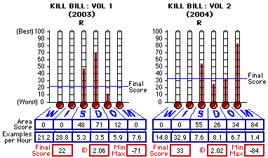![]() (2004), R -- ... surviving a fatal head wound? ![]() Cast/Crew Details Courtesy Internet Movie Database Production (US): Miramax Films, A Band Apart, Super Cool ManChu Distribution (US): Miramax Films Director(s): Quentin Tarantino Producer(s): Lawrence Bender, Koko Maeda, Kwame Parker, Quentin Tarantino Written by/Screenplay: Quentin Tarantino, Uma Thurman Cinematography/Camera: Robert Richardson Music: RZA, Robert Rodriguez Film Editing: Sally Menke Casting: Koko Maeda, Johanna Ray Production Design: Yohei Taneda, David Wasco Art Direction: Daniel Bradford Viewed At: Driftwood Theater 6 Kill Bill: Vol 2, fifth film of Quentin Tarantino, is revenge with an attitude. The Punisher, also now playing is also revenge with an attitude. The attitude? "It ain't good enough, no matter what 'it' is until I get mine my way." The attitude so many of our youth seem to admire in and emulate from performers. Kill Bill: Vol. 2 and The Punisher. Playing side by side. What a bomb looking for someone to explode! Tarantino starts Volume 2 by treating the viewer to a refresher of Volume 1. From Kill Bill: Vol. 1 was DIVAS (Deadly [International?] Viper Assassination Squad), one of Bill's (David Carradine) brainchildren. DIVAS was led by Beautrix Kiddo (Uma Thurman), a.k.a. the Bride, a.k.a Black Mamba. In the refresher we are also treated to a replay of the massacre of a wedding rehearsal party for which Kiddo was the Bride at Two Pines, El Paso, Texas, also known as the El Paso, Texas Chapel massacre. In Volume 2, we see Bill is the one to mastermind the massacre and the blowing a hole in Kiddo's head ... a wound that does not kill her but puts her into a coma for a long time. This tale is the continuation of the tale of Kiddo seeking revenge on Bill. A normally fatal head injury that does not kill the victim? Where else have we heard about surviving a fatal head wound? If any of you remember the old phonograph, recall its three speeds: 33 1/3, 45 and 78 RPM. Volume 1 was 45 RPM. Volume 2 was 33 1/3. Much slower. Much less action. Much more time given to character and plot building. Maybe too much more time. One hundred and twenty six minutes. In that 126 minutes Kiddo kills and names a number of people. Among them was Budd (Michael Madsen), Bill's brother. Once proficient with a sword now a bar bouncer, Budd tries to kill Kiddo by a "Texas Funeral", meaning buried alive, Kiddo succeeds in wasting Budd. After Budd tries to kill Kiddo, Ellie Driver (Daryl Hannah) tries to kill Kiddo but fails. However, Kiddo does not fail to cause severe cost to Driver. Hannah gives a performance after Kiddo rips out Driver's last eyeball reminiscent of Hannah's performances as Pris in Blade Runner of 1982 with Harrison Ford and Rutger Hauer. And, of course, Kiddo kills Bill. With two fingers. A technique she learned from master Pai Mei (Chia Hui Liu). Pai Mei, introduced as a solitary character as any Asian martial arts master would be introduced, combined Western arrogance with Asian confidence and humility. DIVAS were trained by Pai Mei. Why Driver had to poison him I do not remember if I ever knew. There is much more to this two-hour story that can be reasonably summarized. Though it is hard for me to understand why anyone would want to, good way to help you decide whether you want to watch this truly R-rated film, if you have seen Volume 1, is to compare the CAP thermometers of the two movies. Though this feature was intended for use with movies much less ignoble content, it works with them as well. The comparative is provided below. The thermometers for Volume 2 show the effect of the somewhat lighter and fewer attacks on ethics and morality than in Volume 1, most notably in Murder/Suicide: ![]() Let the listing in the Finings/Scoring section tell all that was noted.