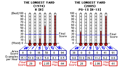 ![]() Cast/Crew Details Courtesy Internet Movie Database Production (US): Happy Madison Productions, Paramount Pictures, Columbia Pictures Corporation, MTV Films, Callahan Filmworks Distribution (US): Paramount Pictures, Columbia TriStar, Sony Pictures Entertainment Director(s): Peter Segal Producer(s): Barry Bernardi, Allen Covert, Michael Ewing, David Gale, Jack Giarraputo, Tim Herlihy, Albert S. Ruddy, Van Toffler Story: Albert S. Ruddy Screenplay: Sheldon Turner (2005), Tracy Keenan Wynn (1974) Cinematography/Camera: Dean Semler Music: Teddy Castellucci Film Editing: Jeff Gourson Casting: Darlene Hansen, John Papsidera Production Design: Perry Andelin Blake Art Direction: Alan Au, Domenic Silvestri Viewed at: Driftwood Theater 6 The Longest Yard is more technological pay dirt for the CAP analysis model. As I typed that I realiuzed pay dirt may indeed be appropriate. The Longest Yard is a R-13 cussfest with 133 uses of some form of foul language in 107 minutes. [Col. 3:8, Deut. 5:11] Most films rated R do not present that much potty mouth. All of it excused, of course, by the notion that such language is typical of prison life. Maybe it is but that does not excuse it in and as entertainment for preteens and new teens let alone adults. It is a sadist's dream. I suspect the portrayed intense brutality on the inmates by prison guards actually happens sometimes. I know this only because Hollywood told me so. Does its reported existence excuse it in and as entertainment? The Longest Yard is also a heavy promotion of the practice of homosexuality, in a misleading, positive, humorous light of course, keeping the harsh and brutal truth about the practice of homosexuality from us in the name of humor. The practice of homosexuality is evidently also part of prison life, again only because Hollywood says so. But does the existence of homosexuality in prison excuse the presentation of it in and as entertainment? [1 Cor. 6:9-10] Does perpetuating these behaviors by emboldening the viewer with them and desensitizing youth to them through uncounted demonstrations of them in and as entertainment excuse their existence in real life let alone in and as entertainment? By His Word, God thinks not. [1 Cor. 15:33, Phil. 4:8] If you who are so inclined to spew "homophobe" want to hear about love strong enough to tell you the truth, read on. But if you want me to hate you by bellowing violations of His Word by accepting the practice of homosexuality and embracing it; by agreeing with you that such behavior is natural, innate, healthy and safe, I won't. To do so would be a real hate crime. I will embrace the doer but I will not embrace the deed. Those of you who repeatedly strut your stuff against this Christian ministry (and quite probably many others) by belching "Homophobe!" and other words of bigotry, intolerance and hate, know this. The one who chooses to practice homosexuality is as precious to Jesus as I and anyone else who breathes I am as much a sinner as everyone else and I am precious to Jesus. And so are you. Just as you are. By the way, Fred Phelps is wrong. God does NOT hate "fags." God hates the deed but loves the doer. And in and by His love for us all, so do I. Just as a good father will still love his son even after the most severe disobedience. At least I have the guts to tell you the Truth. God's Truth, not mine. God loves us ALL. Each and every one who ever has or ever will draw a breath. It is some of our chosen behaviors He hates. By His Word. Not mine. And, yes, the practice of homosexuality is a choice. Every single non-autonomic movement of the human body is a choice. No exceptions. No debate. The Longest Yard earned a final score of 28 out of 100. R-rated movies in the comparative baseline database earned final scores of 54 and below out of 100. The bottom-scoring film in the comparative baseline database, The Specialist, was rated R and earned a final score of 25 out of 10. The final score of 28 out of 10 for The Longest Yard plants it squarely into the R scoring range. Regarding individual investigation area scores, this film earned a score of ZERO out of 100 in Impudence/Hate (I), in Sexual Immorality (S) and in Drugs/Alcohol (D). It earned a R-equivalent non-zero score in each of Wanton Violence/Crime (W) and Offense to God (O). PG-13s are getting raunchier and raunchier year after year. We told you this back in 2000. Harvard University echoed us in 2004. R-rated movies in the comparative baseline database earned influence density scores from 0.86 to 2.04 (the higher the figure the more dense the assaults on morality). Even the Influence Density of 2.86 for this film confirms its R-equivalence since the bottom-scoring film in the comparative baseline database, The Specialist, earned the influence density of 2.04. This PG-13 film earned 2.86, a full 40% more dense than the R-rated The Specialist. The above comparative scoring under the same analysis model using the same methodology, the same investigation standards and the same computer application and even by the same investigator sort of tells you all about the slipping standards of the MPAA and the taking advantage of the slippage by the entertainment industry, doesn't it. I can't wait until some generous individual or individuals provide(s) us with full funding (see our Frequently Asked Questions #4) so that we could afford to compile the massive data we have accumulated since the last time the data was compiled in 2002. As revealed in our R-13 finding which was first published in 2000, in 2002 more than 60% of PG-13 films were R-13. With PG-13 films like The Longest Yard, I shudder to think what percentage of PG-13 films of 2005 are R-13. When we get enough funding, we'll let you know. In no uncertain and inarguable terms. Maybe I will rent a copy of the 31-year old 1974 version of this film where Burt Reynolds played Paul Crewe (Adam Sandler in the 2005 version); Eddie Albert played Warden Hazen (James Cromwell in the 2005 
