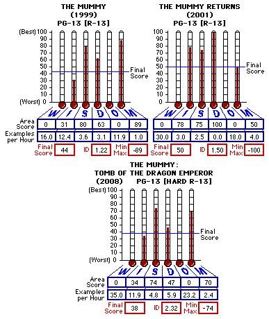 ![]() Cast/Crew Details Courtesy Internet Movie Database Production (US): Universal Pictures (presents), Relativity Media (in association with), Sommers Company, The, Alphaville Films, Giant Studios, Nowita Pictures, Sean Daniel Company Distribution (US): Universal Studios Home Entertainment Director(s): Rob Cohen Producer(s): Chris Brigham, Sean Daniel, Bob Ducsay, James Jacks, Jeff Kirschenbaum, Chiu Wah Lee, Er-Dong Liu, Josette Perrotta, Marc Pitre, Stephen Sommers, Matthew Stuecken Written by: Alfred Gough, Miles Millar 1932 Screenplay: John L. Balderston 2001 Screenplay: Stephen Sommers Cinematography/Camera: Simon Duggan Music: Randy Edelman Film Editing: Kelly Matsumoto. Joel Negron Casting: Ronna Kress Production Design: Nigel Phelps Art Direction: Isabelle Guay (supervising art director) This installment in The Mummy franchise is quite a bit darker in terms of evil and unholiness than The Mummy (1999) or The Mummy Returns (2001). Long ago an evil Chinese king, Han (Jet Li), impervious to even assassins, defeated all the kings of the land and became Emperor. He had conquered all enemies under the sun ... except death. Han had heard of a witch, Zi Juan (Michelle Yeoh) who knew the secret of immortality and sent General Ming Guo, (Russell Wong) his oldest trusted ally and advisor to fetch her. When Zi Juan arrived and met Han, Han became amorous of Zi Juan and ordered that no man shall touch her; that she is his. Han found that Zi Juan did not know the secret to immortality but knew where to find it. So, Ming Guo and Zi Juan set out to fetch the secret. During their treks Ming Guo fell in love with Zi Juan and she with him. Finding the secret in the oldest library known to the culture in an oracle of bones, a long lost collection of all the mystical secrets of the ancient world written on slats of bones, the pair returned to Han. In appreciation of Zi Juan's success Han granted Zi Juan anything she wished. She wanted Ming Guo. Han granted her wish but Zi Juan knew Han would not keep his word. Because of Han's jealousy of Ming Guo and her mistrust of his word Zi Juan used the oracle of bones to cast a spell on Han and his army instead of bestowing immortality on him. Han and all his army were doomed to eternity cast in bronze. Now Han is condemned to the world of the undead. If the curse is ever lifted, Han will rise from the undead and become the ruler of all mankind. Moving up to 1945, retired Col. Richard "Rick" "Ricochet" O'Connel (Brendan Fraser) and wife, Evelyn (Maria Bello) are now lounging in their opulent estate in Oxfordshire, England. They have sworn off any more espionage and adventure. Evie's brother, Jonathan Caranhan (John Hannah) is now operating a night club in Shanghai, China. Alexander Rupert O'Connel (Luke Ford) is now in archaeology college, or is supposed to be. All are quite satiated with their new, comfortable lives ... until a government emissary comes with an offer. Alex is busy digging up the Han ruins in the Ningxia Province when the emissary tempts Rick and Evie with another mission: to courier the Eye of Shangri-La to Shanghai. The Eye of Shangri-La, smuggled out of China in 1940, is supposed to point the way to the Pool of Eternal Life and contains an elixir that will wake the undead emperor and his army. Now, in 1947 the British government would like to return the Eye of Shangri-La to the Shanghai Museum as a political move of good faith to the post-war Chinese people. Not being able to resist the challenge, Rick and Evie accept the mission. And since Jonathan and Alex are already in Shanghai they get pulled into the fray as well. From there the adventure gets underway. A couple tidbits without itemizing the plot and story. The Witch, Zi Juan is immortal and has a daughter, Lin (Isabella Leong) who is also immortal. Both are more than 2000 years old and have been guarding the Pool of Eternal Life in Shangri-La, protecting it from Han's followers placing the Eye of Shangri-La atop the crown of the pool which would wake Han and his army. As an added bonus following is a scoring data comparative of the three Mummy films: 44 out of 100 (1999); 50 (2001); 38 (2008). Each film earned R-13 status (final scores of 54 and below out of 100). Each earned an investigation area score of zero in Wanton Violence/Crime and Offense to God making the scoring earned by the findings in of those investigation areas clearly equivalent to most R-rated films (54 and below out of 100) in the comparative baseline database of films. Little more needs to be said. ![]() Wanton Violence/Crime (W) - Zero out of 100 The violence content of this film is leaps and bounds into the envelope of violence of most R-rated films. Sword play to kill. Graphic warfare battles. Firearms/gunfire to kill. Graphic mutilation of flesh with what looks like blower-fired incineration of the flesh from the inside of the body to then solidify into what appears to be glowing bronze. Fiery coals of matter erupting though facial and other body flesh. Decapitation. A beheaded horse running with what looks to be a smelting furnace looking down its open neck. Icabod Crane was frightened when looking down the neck of the headless horse he rode. I suspect many kids will find hightmare fodder in this film. There is a l-o-t more to the violent behaviors and imagery to this film. Please look to the listing in the Findings/Scoring section for a full accounting of the content. [Prov. 16:29, 3 John 11, Prov. 3:31-32] Impudence/Hate (I) - 34 out of 100 Seventeen times the three/four letter word vocabulary was used, mainly by Jonathan. One euphemistic use of the most foul of the foul words was used. [2 Tim. 2:16-17, Eph. 5:4, Col. 3:8] But other than profanity, the only impudence/hate found was Alex's arrogance against his parents. [Exod. 20:12, 1 Peter 5:5] Sexual Immorality (S) - 74 out of 100 In terms of sexually immoral behavior and/or imagery, this film presented a man and a woman making out in bed ostensibly for