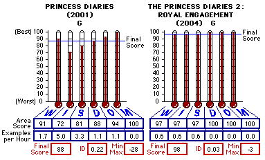 (2004), G -- Even the kisses seen were gentle, warm and humble closed mouth kisses.  Cast/Crew Details Courtesy Internet Movie Database Production (US): BrownHouse Productions, Walt Disney Pictures Distribution (US): Buena Vista International, Buena Vista Pictures Director(s): Garry Marshall Producer(s): Debra Martin Chase, Tom Hines, Whitney Houston, Mario Iscovich, David Scharf, Ellen H. Schwartz Characters: Meg Cabot Story: Gina Wendkos, Shonda Rhimes Screenplay: Shonda Rhimes Cinematography/Camera: Charles Minsky Music: John Debney Costumes: Gary Jones Production Design: Albert Brenner Viewed at: Driftwood Theater 6 http://www.driftwoodonline.com Viewed At: Driftwood Theater 6 With a noble final score of 98 (actually 98.46) out of 100, The Princess Diaries 2: Royal Engagement solidly earns its regal place near the top end of the scoring range earned by G-rated movies (100 to 87 out of 100) in the comparative baseline database. The only morality issues (by God's Word) noted were a lie told at the princess's order to do so [Prov. 19:5], a strong presence of underhandedness in sabotage for personal gain [Hab. 2:9] and one other -- a single inference of sexual immorality. As the princess examined photos of eligible bachelors, one candidate was disqualified because he was already romantically involved - he had a boyfriend. [Jude 1:7] It's a Disney film, folks. For five years Amelia "Mia" Mionette Thermopolis Renaldi (Anne Hathaway), future queen of Genovia, has lived the idyllic life of opulence and pamper, readying herself for taking over the crown as queen of Genovia. Mia, now a college graduate and about to turn 21 years old, found she must marry within 30 days or loose the crown, so sayeth the Parliament of Genovia. Guided by the matronly wisdom of her regent grandmother and current queen of Genovia, Queen Clarisse Renaldi (Julie Andrews), Mia finds the choices of her soon-to-be husband rather slim. Viscount Mabrey (John Rhys-Davies, about an hundred pounds lighter) is pushing for his nephew, Lord Nicholas Devereaux (Chris Pine) to be Mia's new husband so Mabrey can take control of Genovia through his nephew. Another suitor appears to be the likely candidate for King of Genovia, the proper and noble Duke Andrew Jacoby (Callum Blue). While Andrew is the most acceptable in character with many noble achievements and a Ph. D., Lord Nicholas may be the most desirable. Whom will it be? Noble Andrew or conniving Nicholas? Nobody? There is not one issue of foul language in this film. Not one use of God's name in vain. Not one murder and not even one attempted murder. The only issue of Wanton Violence/Crime was the issue of Mabrey's attempts to sabotage the marriage. There were no instances of children screaming obscenities at parents. No drugs or alcohol were noted. While there was drink at some ceremonies it could have been apple cider for all we can know. There were no alcoholic beverage bottles to be seen and there were no bubbles in the drink. Even the kisses seen were gentle, warm and humble closed mouth kisses. I'll not spoil any more of the story in case you decide the film is fit for your family. Feel free to look over the listing in the Findings/Scoring section if you wish but I've already told you its content. Just for your information, below is a comparative of the two Princess Diaries films.  Noting a few of the traditional reviews of this film on the web, I noticed that almost every one of them belittled and degraded this G-rated film and the likewise G-rated Princess Diaries of 2001. I've also noticed that almost all the films that win awards are rated R. That says something. It says what I have been saying for years: we have become so drugged by the narcotics of extremes in and as entertainment that what once was morally unacceptable has become morally invisible. Everyone seems to expect harsh and bold assaults on morality and decency. Even God warned us about such sliding morals in Psalm 12:8. PS: Two of the scenes in the trailer/commercial were not noted in the cut I saw: the 12 year old boy dancing with Mia with his head between Mia's breasts and her sitting in Parliament in a chair in a short skirt with the camera focused on her legs and with her foot pushing a button and the chair lowering into the floor. SCRIPTURAL APPLICATION(S) If needed to focus or fortify, applicable text is underlined or bracketed [ ] or bold. If you wish to have full context available, the Blue Letter Bible is a convenient source. If you use the Blue Letter Bible, a new window will open. Close it to return here or use "Window" in your browser's menu bar to alternate between the CAP page and the Blue Letter Bible page. CHAPTER/VERSE ***Selected Scriptures of Armour against the influence of the entertainment industry*** As always, it is best to refer to the Findings/Scoring section -- the heart of the CAP analysis model -- for the most complete assessment possible of this movie. |  | (The heart of the CAP Analysis Model)  Wanton Violence/Crime (W) Impudence/Hate (I) Sexual Immorality (S) Drugs/Alcohol (D): Offense to God (O) Murder/Suicide (M) |