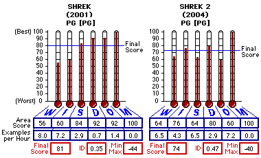 ![]() (2004), PG -- Shrek 2 is not only darker than the Shrek of 2001 , it is not as funny. ![]() Cast/Crew Details Courtesy Internet Movie Database Production (US): DreamWorks SKG, Pacific Data Images Distribution (US): DreamWorks Distribution LLC Director(s): Andrew Adamson, Kelly Asbury, Conrad Vernon Producer(s): Jeffrey Katzenberg, David Lipman, Aron Warner, John H. Williams Characters: William Steig Screenplay: J. David Stem, Joe Stillman, David N. Weiss Music: Stephen Barton, Harry Gregson-Williams, David Bowie, Kathleen Brennan, Christopher Carrabba, Nick Cave, Desmond Child, Steven Greenberg, Robby Rosa, Pete Shelley, Jim Steinman, Tom Waits Film Editing: Michael Andrews Production Management: Tony Cosanella, Jennifer Dahlman, Philip R. Garrett Costume Design: Isis Mussenden Art Department: Steven E. Gordon, John Stevenson Viewed At: Driftwood Theater 6 From flatulence by both Shrek (Mike Myers) and Fiona (Cameron Diaz) in a mud bath to a beach scene from Here to Eternity where Fiona feeds a mermaid to the sharks for bumping her off Shrek in a wave, we are witness to the wedded bliss between Shrek and Fiona following their escapades of self-discovery in the Shrek of 2001. All manner of honeymoon joys are shared by the perky pair. Now it is time to "Meet the Parents." Her parents. Fiona's parents, King Harold (John Cleese) and Queen Lillian (Julie Andrews) in Far, Far Away (700 miles far, far away) sent a formal invitation to the nuptial pair in their swamp paradise. Shrek is not at all comfortable with the idea of meeting Fiona's parents. Fiona is a princess. Daughter in royalty. Shrek is an ogre. Shrek is certain that being an ogre will be a barrier to social success and familial harmony with her parents. After Shrek puts his foot down to Fiona dictating they are NOT going, it is off to Far Far Away ... with donkey (Eddie Murphy) to keep Shrek and Fiona company, asking "Are we there yet" about every mile or so. And popping his lips about ever other nerve. Recall Los Angeles and the famous "Hollywood" sign on the hill and you will have the picture of Far Far Away, complete with stretch limo-carriages and sprawling mansions with "Rapunzel" and "Cinderella" emblazoned in wrought iron above the ranch-size gates. King Harold is less than cordial while Queen Lillian is the peace-keeper and compromise-maker. But as much as Lillian and Fiona try to smooth the relationship between Shrek and King Harold, friction rules. Shrek and Fiona are married and there is nothing King Harold can do about it. But the fairy godmother - err - fairy witch (Jennifer Saunders) can. She has plans for her son, Prince Charming (Rupert Everett) and Fiona. The witch wants her son to steal Fiona and will stoop to forcing King Harold to hire hit man, Puss-in-Boots (Antonio Banderas) to kill Shrek to get her way. Yes, to kill Shrek. Now starts the battle. A battle between the fairy godmother witch, King Harold and Shrek. The witch uses every manner of concoction, potion and incantation to witch Fiona away from Shrek [Rev. 21:8]. Shrek 2 is not only darker than the Shrek of 2001 , it is not as funny. Nor does it have as much to say as the Shrek of 2001. Shrek 2 is funny in a few places but all too often it tries to be funny with crude and rude, even vulgar humor such as having Pinocchio do the "Michael Jackson" dance and grab his privates while doing a pelvic thrust. [Eph. 5:4] Another instance is Puss-in-Boots licking his privates twice while purring. And these two scenes are not just of a cat. Once an animated character, even an animal is personified with a human personality communicating as a human the character stops being just a cartoon character to the young viewer. Yet one more example of vulgar humor is Pinocchio admitting to wearing women's thong underwear. Maybe the "kinky" of that will make no sense to the very young, depending on their level of experiential development, but the imagery or idea is still planted, lending to becoming desensitized to such sexually immoral habits [Deut. 22:5]. As I've said before folks, I didn't write the movie. If this stuff sounds vulgar to you here in print, wait until you see it in the movie. Harvard educated child developmental expert and psychology professor Dr. Karen Nelson and practicing counselor Dr. Larry Gilliam agree with me that it would be unusual for even a 16 year old to be able to fully separate fantasy from reality or to fully anticipate the consequences of his/her actions. This movie is targeted at a much younger audience than 16. And examples of behavior and imagery such as the ones above stick with your kids, folks. They remember it. Often for life. Don't you still remember Bambi and when his mother was shot? This is all too bad, too. Shrek 2 is the most astounding computer animation I have ever seen. The level of detail and attention to it is exemplary. And there is much more to the story but since this analysis is being posted on opening day, I do not want to spoil the film for you any more than I already have. But I do ask that you please read the listing in the Findings/Scoring section for yourself before deciding whether to take your little ones to see this film. For your information, a comparative betweent the Shrek of 2002 and this Shrek 2 is provided below. ![]()