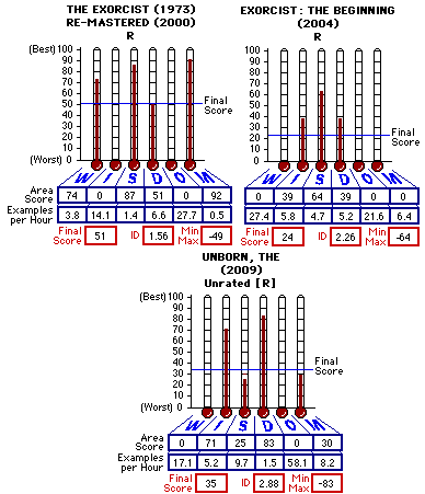 ![]() Cast/Crew Details Courtesy Internet Movie Database Production (US): Relativity Media, Rogue Pictures, Platinum Dunes, Phantom Four Distribution (US): Universal Studios Home Entertainment Director(s): David S. Goyer Producer(s): Michael Bay, William S. Beasley, Jessika Borsiczky Goyer, Andrew Form, Bradley Fuller Written by: David S. Goyer Cinematography/Camera: James Hawkinson Music: Ramin Djawadi Film Editing: Jeff Betancourt Casting: Juel Bestrop, Seth Yanklewit Production Design: Craig Jackson Art Direction: Gary Baugh Viewed on Universal Studios Home Entertainment DVD This analysis is sponsored by the generosity of E&HP and C&EZ. I have an IQ of 139 but the minute details of connectivity of an evil-oriented plot and story such as The Unborn sometimes escape me. So, I am not going to try to discuss the story or plot in any great detail. I don't have the mind-set to figure out what all the subtle hints and suggestions evil programming tries to say. I suppose it makes sense that story holes and gaps occur when trying to build a story involving things that simply do not exist. But I will do my best to give you enough information for you to be in a better position to make an informed moral decision on your own whether this film is fit. In the COMING SOON enewsletter announcing the upcoming analysis of The Unborn I reported that the DVD comes with both the unrated version and the PG-13 version: that I would prepare a separate analysis of the PG-13 version following the analysis of this unrated version. This report is analysis of the unrated version. I will prepare an analysis of the PG-13 version and in it will prepare a scoring distribution comparative of the two versions for your information. Comparative analysis of an unrated and rated version of the same film will be at least interesting to find out the content differences. To be unrated means the MPAA did not see or rejected a version of a film. They apparently deemed the PG-13 version acceptable for 13 year olds and older. But what is it about this unrated version? "Unrated" means anything goes. Were parts chopped from the unrated version to permit the MPAA to slap a 13-year-old-acceptable label on it? We'll see. An unborn son of Gordon and Janet Belden (James Remar and Carla Gugino) died while in utero. Gordon and Janet gave the boy the nickname of Jumby but gave him no surname since the time he died was so early in the pregnancy. Along with Jumby in mom's uterus was Casey, his twin sister. Jumby died because Casey's umbilical cord wrapped around Jumby's neck. Apparently Jumby did not like that. By the way, I have been an emergency medical technician for years and I know about prolapsed cord (the umbilical cord appearing before the baby) and a baby's own cord getting wrapped around his/her neck but I've never heard of a baby's cord getting wrapped around a twin's neck. Besides, babies do not breathe while inside the womb. It is now years later and Casey is in college. Jumby's spirit, or dybbuk (a soul barred from Heaven), has been circling around, bouncing between hosts for all those years -- waiting for the right time to get his sister. Jumby is ready to be born now. At least, so sayeth four year old Matthew Newton (Atticus Shaffer), so sayeth the hand written text on a college classroom chalkboard, and so sayeth Casey's class notes. Jumby is dead but he is ready to be born. I guess this is supposed to make sense since Jumby never got the chance to be born and his dybbuk is grasping for anything he can find to enable him to live since he is barred from Heaven. I guess. But the fact is that if one's soul is barred from Heaven there is only one other "place" it can go. Especially since the story says the dybbuk is a condemned soul. Condemned? To where? Unless I missed it Hell is not mentioned anywhere in the script except as an expletive. And on top of that, a baby's soul is never condemned. It is blessed. Just another hole in the story I guess. We all need to get some wind chimes and hang them in our windows (the story claims wind chimes detect dybbuks). But how can a dead infant be born? According to the story, by its dybbuk possessing the body of a host, be it insect, animal or human. Typically (typically?) the host becomes one of the most grotesque demonic creatures ever to invade the big screen. And the only way for the dybbuk to be "kilt" is by exorcism. Much of the screen time for this film is spent portraying trying to exorcise Jumby's dybbuk out of Casey, then out of Episcopal priest Arthur Windham (), then out of Casey's boyfriend, Mark () ... By the way, the writers' use of Psalm 91 as the exorcism chant is fairly true to the Bible but not 100%. True to the text of Psalm 91 anyway but not to the purpose of it. I suppose to a lot of viewers Psalm 91 will now be known as the exorcism chapter. Remember the "chant" Jesus used to cast the demons out of the men into the pigs? "Go." That is it. [Matt. 8:32] Such is the entire theme of this Exorcist-like horror film. Indeed, this unrated 2009 film with a 2009 brother rated PG-13 earned a much more severe final score than the R-rated The Exorcist (Remastered) of 2000 and nearly as severe a final score as the likewise R-rated Exorcist: The Beginning of 2007. I have no doubt at all that the PG-13 brother of this film will earn a hardcore R-13 final score. I'll let you know. But just for comparison purposes since The Unborn seems to have the same theme as The Exorcist films, below is the scoring data distribution for The Exorcist (Remastered) of 2000 and for Exorcist: The Beginning of 2004 pus the scoring data distribution for this film. Wanton Violence/Crime (W) - Zero out of 100 Violence is rampant. Terror sequences and horror images of demonic critters abound. I say "critters" because demonic possessions in this film are not limited to humans. A "possessed" little boy is seen lying on a bed next to a woman, the boy then pushes up the woman's t-shirt to expose her abdomen then