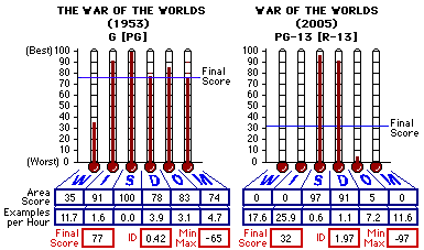 ![]() Cast/Crew Details Courtesy Internet Movie Database Production (US): Paramount Pictures, DreamWorks SKG, Amblin Entertainment, Cruise/Wagner Productions Distribution (US): Paramount Pictures, DreamWorks SKG Director(s): Steven Spielberg Producer(s): Kathleen Kennedy, Paula Wagner, Colin Wilson Novel: H.G. Wells Screenplay: Josh Friedman, David Koepp Cinematography/Camera: Janusz Kaminski Music: John Williams Film Editing: Michael Kahn Casting: Terri Taylor, Debra Zane Production Design: Rick Carter Art Direction: Tony Fanning, Andrew Menzies, Edward Pisoni, Tom Warren Viewed At: Driftwood Theater 6 I was invited to and was able to attend a local screening of War of the Worlds (2005) late night Tuesday, June 28, 2005, the night before the first showing. I was also able to complete the scoring calculations early AM of opening day. Since I was able to get the scoring calculations completed early AM of June 29, folks who have joined our private distribution email list received the scoring data for this film at 2:55 AM the morning of the opening day, plenty of time before the first showing. Barring delays such as happened with this report, early information is possible for several of the films we analyze. If you join our private distribution list you may occasionally receive early information, too. But due to numerous higher priority action items (taking our foster daughter whom we will be adopting [adoption number eight] to her cardiologist and a plethora of foster/adoptive parenting and licensing matters) I was not able to prepare this Summary/Commentary nor the web page until today, July 3, a five-day delay. Since War of the Worlds is four days old already it may be useless to continue. But I am going to anyway. The bottom line is that until this ministry can provide enough operating expenses and salary that my wife can quit her job to be the one to stay home with the nine kids (seven adopted kids, one foster daughter soon to be adopted and another foster daughter), this ministry takes a back seat. Until full funding is available for operation of the CAP ministry, delays such as this are inevitable (and many analyses missed altogether). [I'll get to War of the Worlds in a minute or two.]